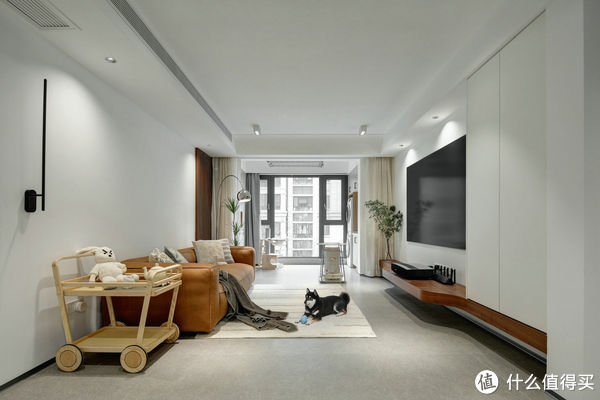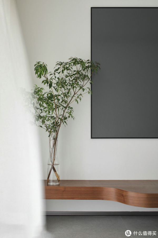还有电视柜,弧形设计是现场打的悬挂式,再用木饰面包裹起来,也让空间变得温暖起来。