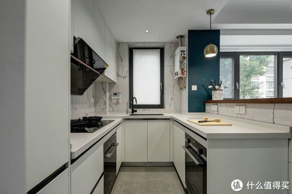 先来看厨房,整体用了黑白灰色系,“U”型设计的橱柜最大程度利用了空间,把靠近玄关的墙拆掉还有个优点,那就是放东西更方便了,去超市回来后随手就能将买回的日用品放在台面上。