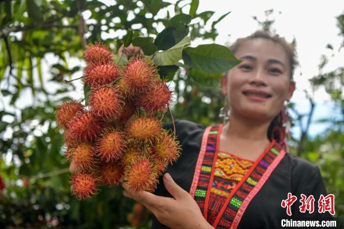 图为海南保亭黎族姑娘展示当地特色水果红毛丹。 骆云飞 摄